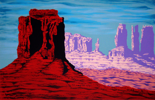 It was a little photograph in a travel ad relative to southern Utah, I think it was, that inspired me to do this playing with color experiment a few years ago. Of course, I pumped up the color as compared to nature. I did an original, my oldest son wanted it, so I did another that I liked better to give him. This ‘brilliant colorist’ style acrylic painting on canvas is fairly large by some people’s standards, but one of my smaller ones these days (my smallest being about 24 by 30 inches and my larger paintings as big as I can find canvases for purchase – I used to make my own, but I’m too tired to do all that kind of work these days – I’d rather spend my time painting, writing and doing other easy creative things). I’ve recently started another version of this in a neo-Van Gogh inspiration on a big canvas.