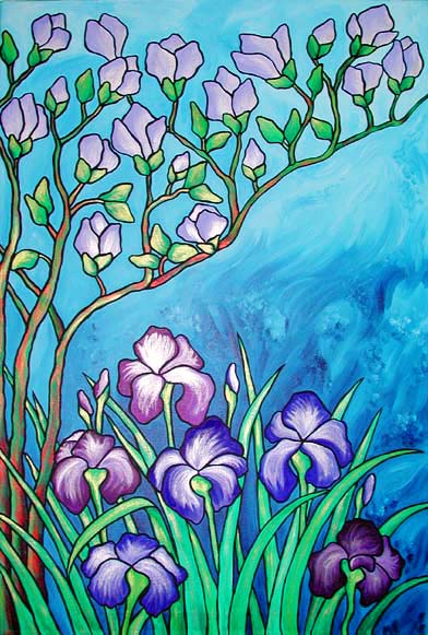 Because I love late Victorian and Edwardian Tiffany glass artwork (windows and lamps), and though I once thought I might like to, I’m not about to get serious about actually doing it myself at this point in life, I decided to try painting in the spirit of that style. This is my first attempt. I love blues, greens, purples, Irises and there are also Blue Magnolias as a sort of backdrop in this rendition. I don’t know if magnolias exist in blue, but, in my mind’s eye they do. This is a fairly large painting that hangs in our front sitting/dining room (and has garnered a good deal of compliments). I haven’t been able to part with it for any proffered money. So, I guess this painting remains my own to keep.