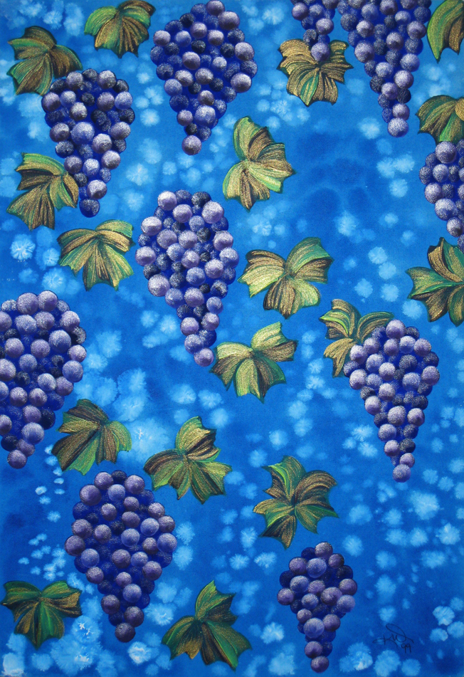 In our Seattle East-side eastward home, I had open shelves in front of the window above the kitchen sink, full of a blue glass collection: bottles and goblets mostly, in turquoise and cobalt blues. It was blue beautiful when the rarely-there sun shone in that window from our back secluded acreage yard. Almost like stained glass. Blues and then later, a few greens and purples added too. The otherwise quite white kitchen would be filled with shades of blue-ish light especially on those special sunny summer days. Throughout the kitchen, there was only one lone wall that begged for a painting – it was beside the table eating area that overlooked the long adjacent family room, that was full of paintings. I didn’t think long on what to paint on a fair-sized canvas for that purple to greenish blues vision. I decided to do a splash of grapes. Ultimately, it ended up with raining clusters of grapes. Yummy. For my kitchen of blues. And purple. And Green. Tasty. Grapes.